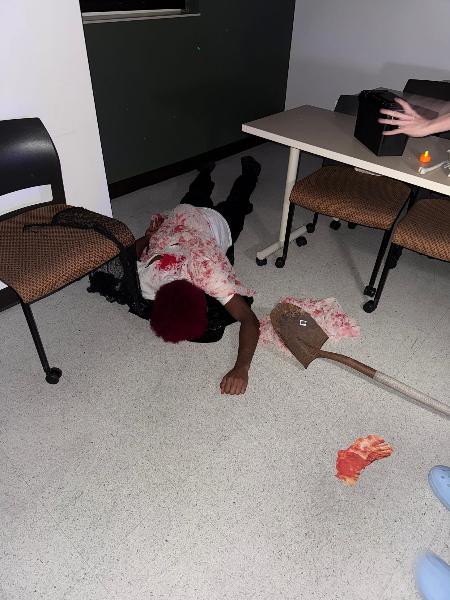 Zay Kemp poses as a missing runner in the Outdoor Society and Running Club Escape Room. Photo by Lucy Raymond.