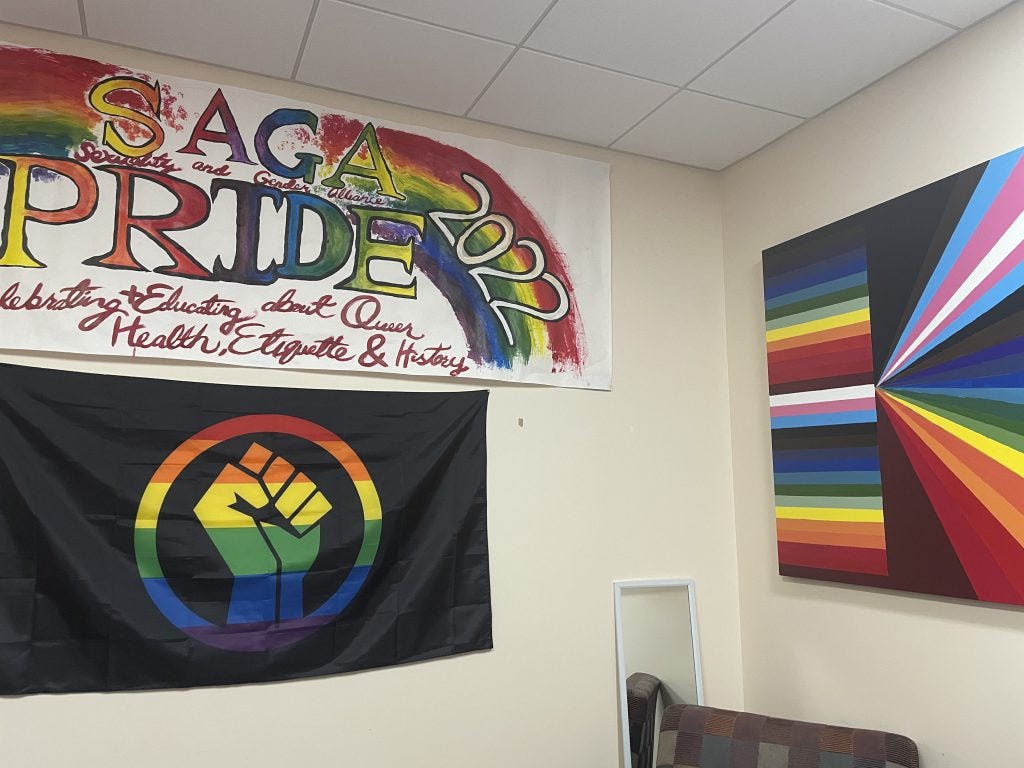 Located in room 135 in the Center for Science and Business, this room is used as a gathering area as well as just a place to relax. The space is decorated with flags representing many different identities, quotes promoting individuality and safety, as well as canvases created by the SOFIA art group