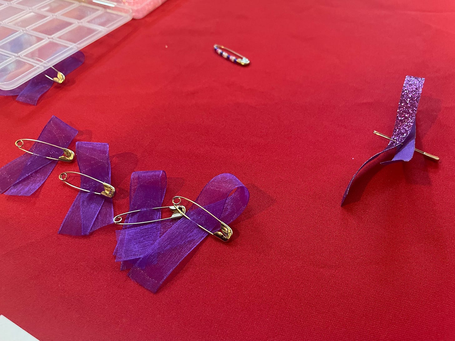 Handmade purple ribbon pins by Madison Riggs. Photo by Dawsyn Wilson