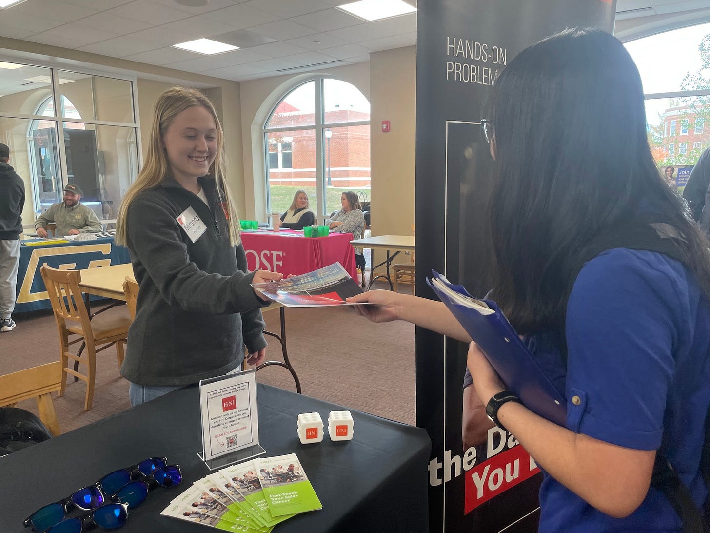 Students searching for summer internships or a job after graduation brought their resumes to hand out to potential employers. “It is a great opportunity for students to build their network and practice introducing themselves in a professional way,” said Steach. Representatives answered students’ questions and offered insights into their industry and job searching in general.